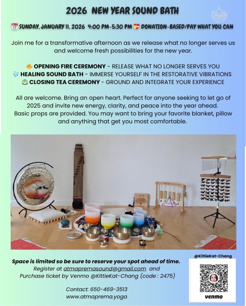 Join us for a deeply restorative 2-hour experience on December 20th as we honor the winter solstice—the longest night of the year and a time for rest, reflection, and renewal. In this nurturing workshop, you’ll be guided through Gentle Yin Yoga, Healing Sound Bath, and Restorative Massage. Slow down, let go, and give yourself the gift of deep rest during this busy season. Whether you’re seeking stress relief, better sleep, or simply a pause from the demands of daily life, this workshop offers a sacred space to reconnect with yourself. Register at atmapremasound@gmail.com and purchase ticket at Venmo@KittieKat-Chang. For more information Contact Kat at 650-469-3513. [ 💞 🎉 SOLD OUT! 🎉 💞 ]